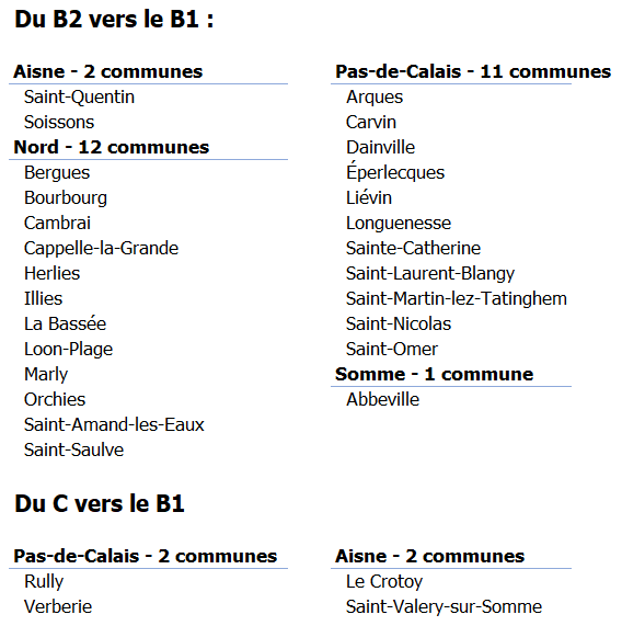 Cette révision du zonage par l’arrêté du 5 septembre s’accompagne d’une seconde vague dédiée au déclassement du zonage. 6 communes sont concernées en région Hauts-de-France. Cela s’explique principalement par le retour en arrière de mises à jour récentes :